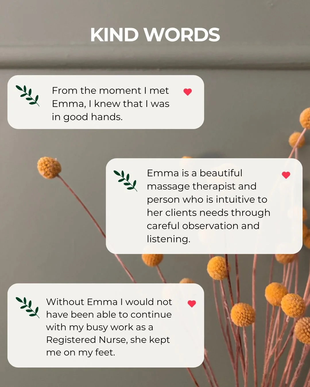 Before studying massage, I received great benefit incorporating regular massage treatments into my self-care routine over the years and truly believe in its powerful role to restore both mind and body.